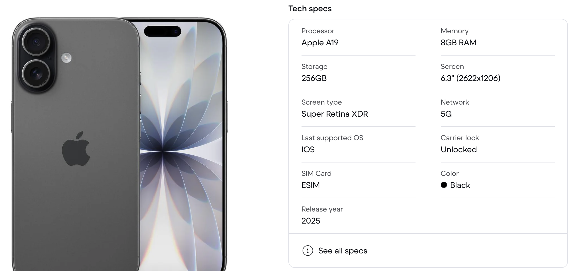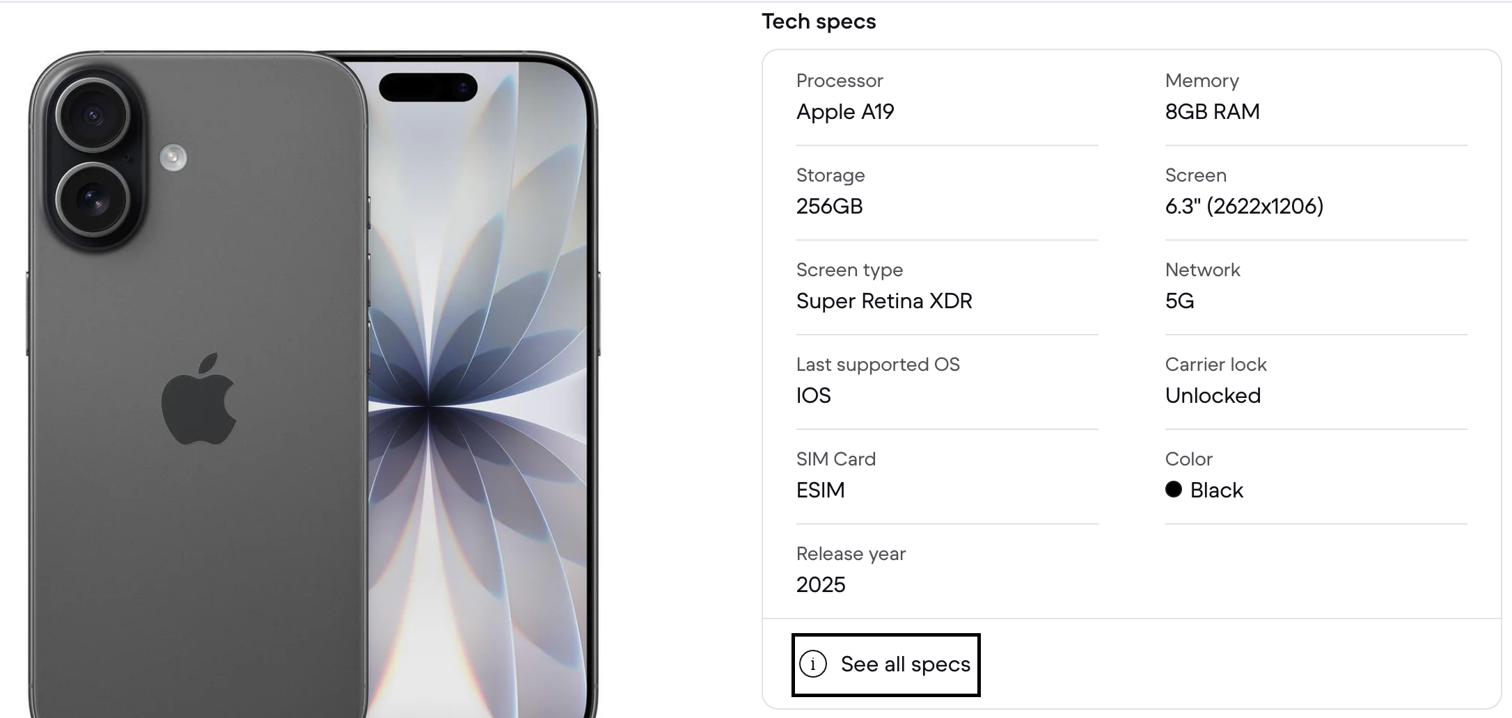 - Go to the product page: Look for the “Technical Specifications” (Tech Specs) section on the product page.