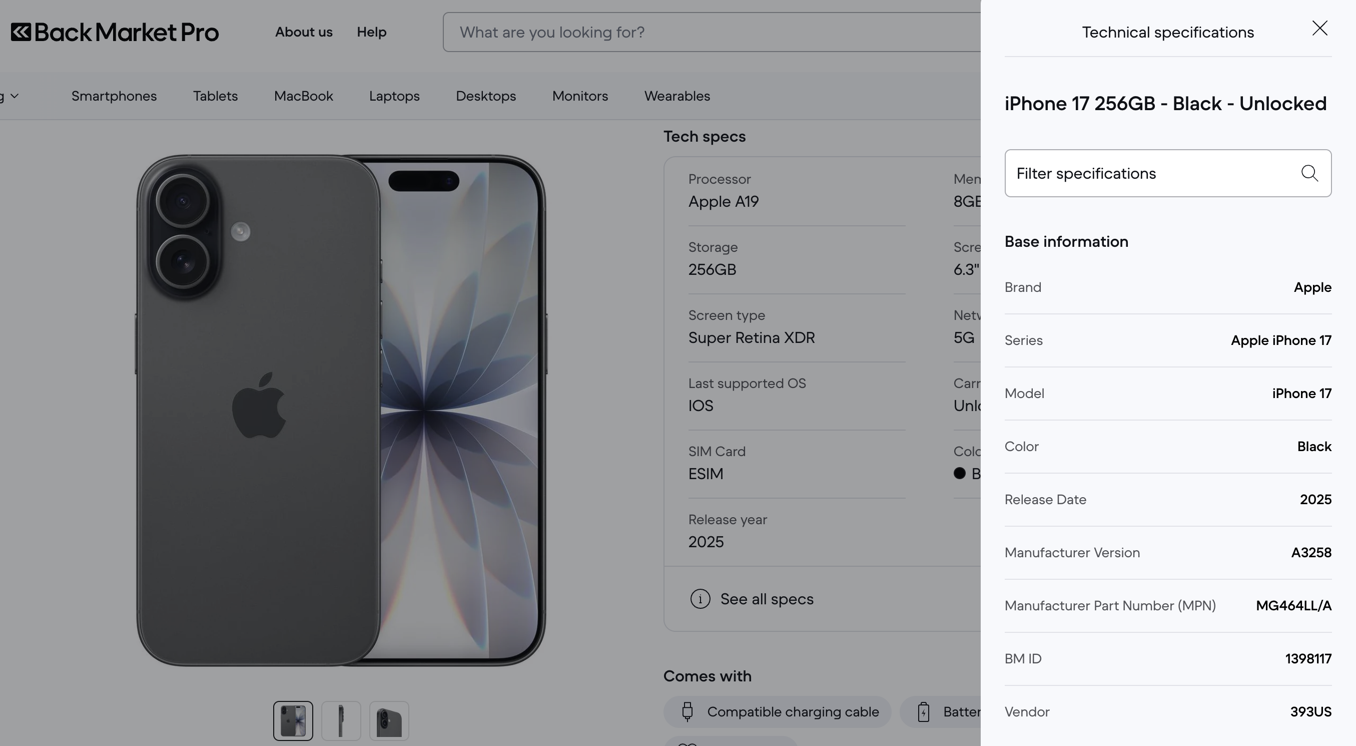All general information about a product’s technical specifications is available in the "Technical Specifications" section of the product page. There you will find details such as the model, capacity, or operating system.